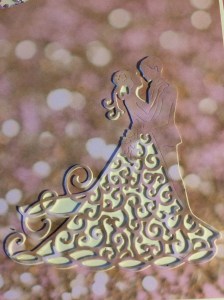 Den zweiten (romantischen) Akzent habe ich durch das Brautpaar in der „Floating Letters“ Technik erzielt. Ich LIEBE diese Technik, auch wenn es mit einem solchen (extrem filigranen) Framelit wie diesem Brautpaar eine sehr fitzelige Angelegenheit ist! Das Brautpaar wurde aus dem Designerpapier ausgestanzt und anschließend noch 3x mit dem Cardstock der Grundkarte (zarte Pflaume). Alle Teile wurden zusammengeklebt um Höhe zu erreichen. Anschließend wurde das (nun deutlich dickere) Brautpaar wieder in die Aussparung auf dem Designerpapier pass-genau eingesetzt. So entsteht der Eindruck, das Brautpaar würde sich aus der Karte erheben. Schön, nicht wahr ?!