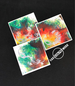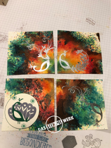 irgendwann muss ich noch in „Bruhso Entzugstherapie“ 🙂 Aber egal, ich liebe es, mit diesen Farbpigmenten zu arbeiten. Gestern habe ich einen Hintergrund gestaltet und dachte mir, der ist viel zu schade für „nur“ eine Karte. Also habe ich einfach vier kleine (9x9cm) Karten daraus gemacht.